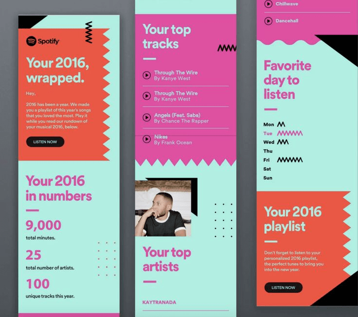 Spotify’s “Your Year Wrapped” email campaign is a gold-standard example of email marketing design. These promotional emails are sent out every December to showcase users’ listening habits over the past year.