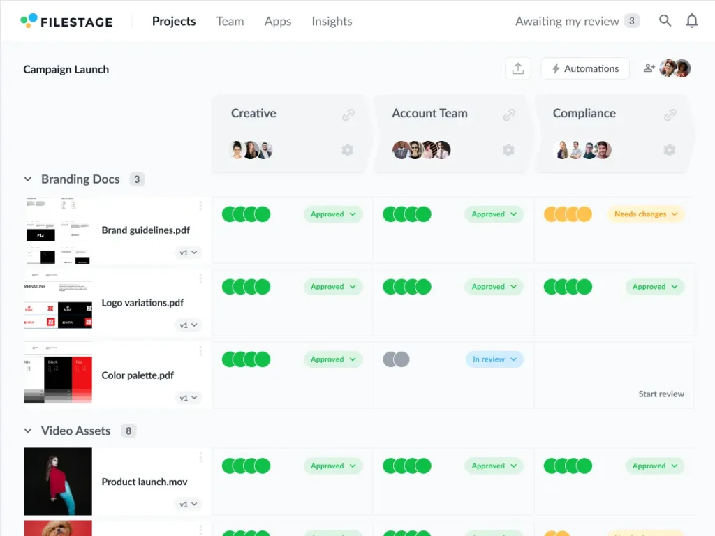Ihr Projekt-Dashboard in Filestage zeigt Statusanzeigen für jeden Ihrer Reviewer an. Wenn sie dann Änderungen anfragen oder die Datei freigeben, wird diese Anzeige orange oder grün. So können Sie den Status aller Personen auf einen Blick sehen.